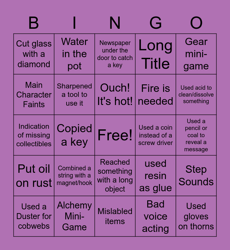 This bingo card has a free space and 29 words: Used a Duster for cobwebs, Missing handle, Copied a key, Had to melt something, Cut glass with a diamond, Newspaper under the door to catch a key, Sharpened a tool to use it, Combined a string with a magnet/hook, Used a coin instead of a screw driver, Alchemy Mini-Game, Used a pencil or coal to reveal a message, Used gloves on thorns, Mislabled items, Bad voice acting, Used acid to clean/dissolve something, Morphing objects + collectibles, Reached something with a long object, Put oil on rust, Gear mini-game, Indication of missing collectibles, used resin as glue, Spent more than 5 mins on mini-game, Fire is needed, Main Character Faints, Long Title, Water in the pot, Step Sounds, Ouch! It's hot! and Single glove or shoe.