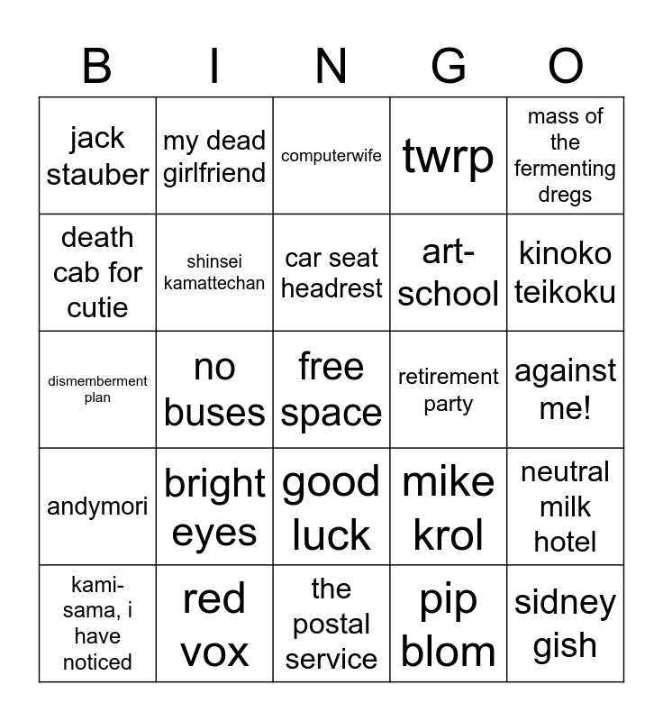 This bingo card has a free space and 24 words: bright eyes, red vox, car seat headrest, kami-sama, i have noticed, mass of the fermenting dregs, jack stauber, death cab for cutie, my dead girlfriend, retirement party, good luck, art-school, dismemberment plan, mike krol, neutral milk hotel, shinsei kamattechan, pip blom, against me!, computerwife, kinoko teikoku, no buses, sidney gish, andymori, twrp and the postal service.
