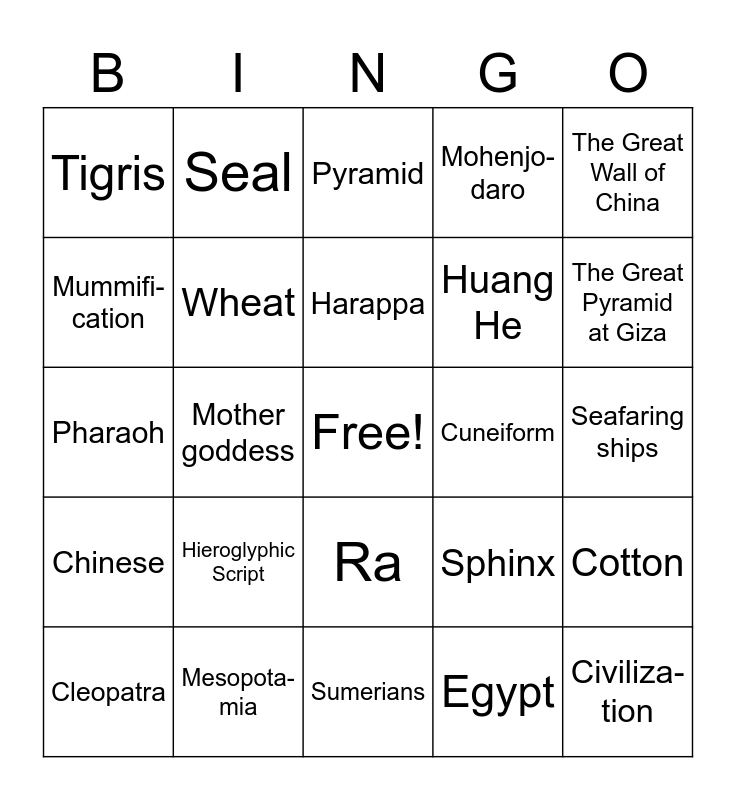This bingo card has a free space and 30 words: Mesopota-mia, Block printing, Mother goddess, Ziggurat, Tigris, Pyramid, Wheat, Ra, Cuneiform, Sumerians, Seafaring ships, Civiliza-tion, Egypt, Confucian-ism, The Great Pyramid at Giza, Porcelain, Sphinx, Chinese, Hieroglyphic Script, The Great Wall of China, Pharaoh, Shang, Seal, Huang He, Mummifi-cation, Mohenjo-daro, Cotton, Cleopatra, Harappa and Pashupati.