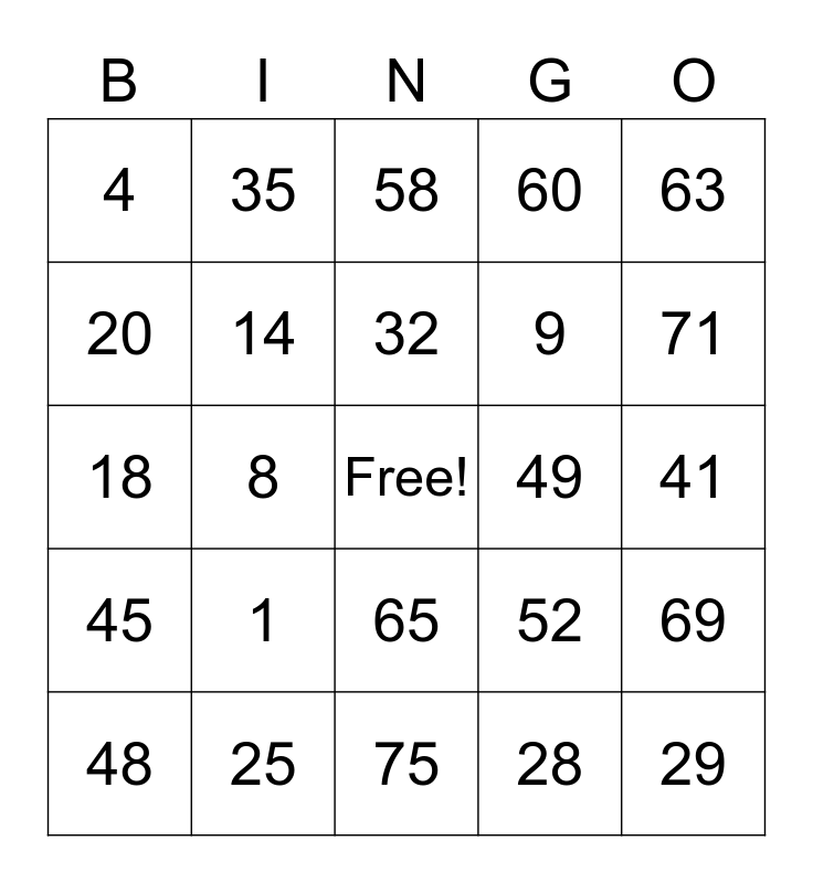 This bingo card has a free space and 24 words: 1, 25, 32, 48, 63, 4, 20, 35, 49, 65, 9, 18, 52, 69, 14, 28, 41, 58, 71, 8, 29, 45, 60 and 75.