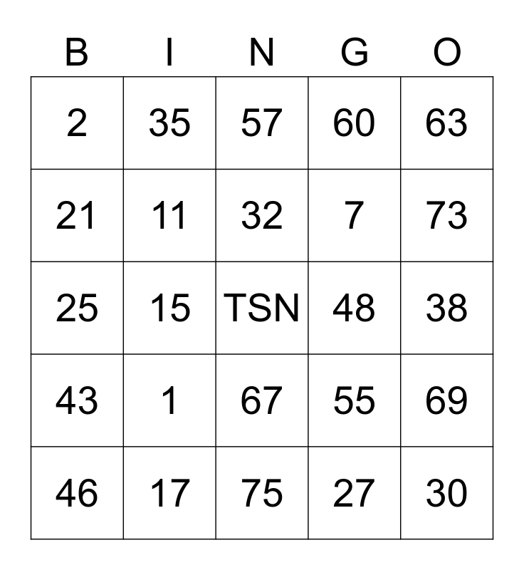 This bingo card has a free space and 24 words: 1, 17, 32, 46, 63, 2, 21, 35, 48, 67, 7, 25, 55, 69, 11, 27, 38, 57, 73, 15, 30, 43, 60 and 75.