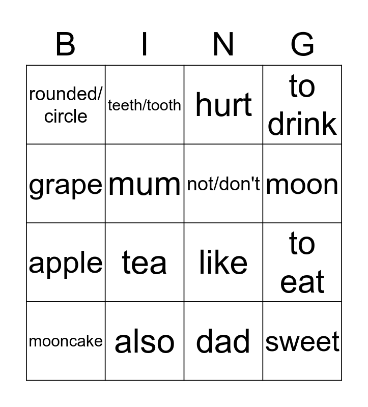 This bingo card has a free space and 15 words: mooncake, sweet, hurt, rounded/ circle, moon, grape, tea, dad, mum, apple, to eat, to drink, not/don't, teeth/tooth and also.