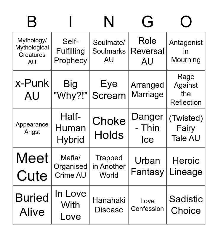 This bingo card has 80 words: Alpha/Beta/Omega AU, Superheroes/ Superpowers AU, Soulmate/ Soulmarks AU, Fantasy AU, Sci-fi AU, Cowboy/ Western AU, Fandom-specific AU, Fusion Crossover AU, Historical AU, Time Travel AU, High school/ College/ University AU, Apocalypse AU, Role Reversal AU, Mythology/ Mythological Creatures AU, Pirate AU, x-Punk AU, Childhood Friends AU, Mafia/ Organised Crime AU, Alternate Employment AU, (Twisted) Fairy Tale AU, Alone in a Crowd, Antagonist in Mourning, Appearance Angst, Eye Scream, Big "Why?!", Broken Hero, Heal It With Booze, Despair Event Horizon, Self-Surgery, My God, What Have I Done?, Rage Against the Reflection, Survivor's Guilt, Hanahaki Disease, Sadistic Choice, Buried Alive, Danger - Thin Ice, Mortal Wound Reveal, Rasputinian Death, Mind Control, Choke Holds, Historical Fantasy, All Myths Are True, Does Not Like Magic, Magic Knight, Magitek, Self-Fulfilling Prophecy, Standard Fantasy Races, The Chosen One, Artifact of Doom, Jerkass Gods, Heroic Lineage, Half-Human Hybrid, Urban Fantasy, The Hidden Hour, Science Wizard, Elements of Nature, Black Magic, Here There Be Dragons, Soul Jar, Trapped in Another World, Arranged Marriage, Green-Eyed Epiphany, Childhood Friend Romance, Rejected Marriage Proposal, Lovable Rogue, Fake Relationship, Star-Crossed Lovers, Battle Couple, Unresolved Sexual Tension, Bodyguard Crush, Meet Cute, In Love With Love, The Matchmaker, Rescue Romance, There Is Only One Bed, First Kiss, Love Confession, Romantic Rain, Undercover as Lovers and Secret Relationship.