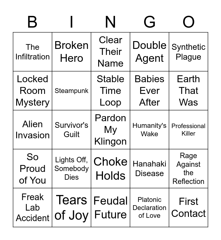 This bingo card has 80 words: Absence of Evidence, Bluffing the Murderer, Clear Their Name, Cowboy Cop, Everyone Is A Suspect, Make It Look Like an Accident, Mob War, Recruiting the Criminal, Undercover Cop Reveal, Detective Mole, Honor Among Thieves, The Syndicate, Double Agent, The Infiltration, The Con Within A Con, Locked Room Mystery, The Stakeout, Lights Off, Somebody Dies, Signature Item Clue, Professional Killer, Cyberpunk, Synthetic Plague, Alien Invasion, Stable Time Loop, Steampunk, AI is a Crapshoot, Space Western, Terraform, Cloning Blues, Cyborg, Earth That Was, Faster-Than-Light Travel, Feudal Future, First Contact, Freak Lab Accident, Humanity's Wake, Uplifted Animal, The Multiverse, Space Pirates, Pardon My Klingon, Alone in a Crowd, Antagonist in Mourning, Appearance Angst, Eye Scream, Big "Why?!", Broken Hero, Heal It With Booze, Despair Event Horizon, Self-Surgery, My God, What Have I Done?, Rage Against the Reflection, Survivor's Guilt, Hanahaki Disease, Sadistic Choice, Buried Alive, Danger - Thin Ice, Mortal Wound Reveal, Rasputinian Death, Mind Control, Choke Holds, Babies Ever After, Cheery Pink, Comfort Food, Everybody Lives, Happily Adopted, Home Sweet Home, Happy Dance, Pet the Dog, Pursue the Dream Job, Happily Married, So Proud of You, Tears of Joy, You Are Not Alone, Family of Choice, Bear Hug, Friendship Trinket, Platonic Declaration of Love, Vitriolic Best Buds, The Power of Family and Hot Drink Cure.