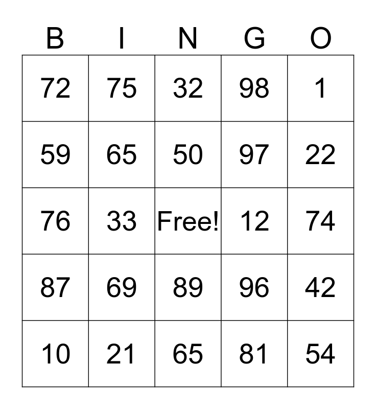 This bingo card has a free space and 24 words: 69, 21, 50, 10, 1, 72, 59, 75, 12, 89, 97, 76, 96, 42, 65, 81, 74, 32, 22, 33, 54, 87, 98 and 65.