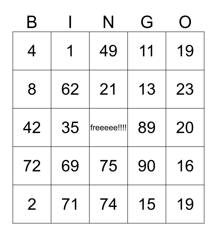 This bingo card has a free space and 24 words: 69, 71, 21, 2, 19, 4, 8, 1, 89, 75, 13, 42, 90, 16, 62, 15, 20, 49, 23, 35, 19, 72, 11 and 74.