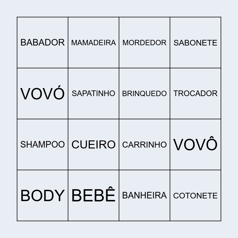 This bingo card has 21 words: BEBÊ, FRALDA, MAMADEIRA, CHUPETA, BANHEIRA, BRINQUEDO, BABADOR, MORDEDOR, CARRINHO, TROCADOR, SHAMPOO, SABONETE, COTONETE, ALGODÃO, SAPATINHO, LEITE, BODY, CUEIRO, VOVÓ, VOVÔ and PAPAI, MAMÂE, DINDA, DINDO.