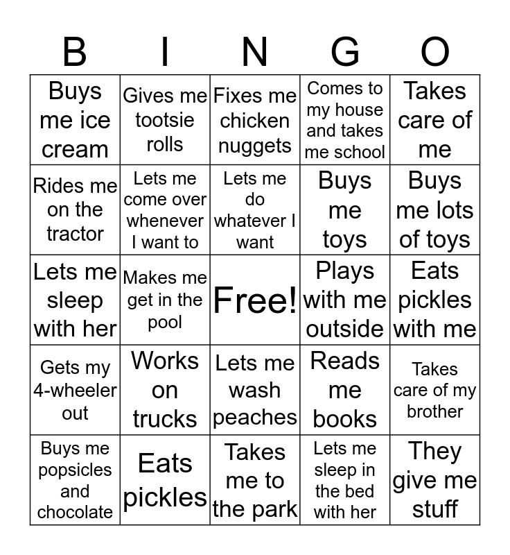 This bingo card has a free space and 24 words: Works on trucks, Eats pickles, Lets me do whatever I want, Buys me popsicles and chocolate, Takes care of me, Buys me ice cream, Rides me on the tractor, Gives me tootsie rolls, Plays with me outside, Lets me wash peaches, Buys me toys, Lets me sleep with her, Reads me books, Takes care of my brother, Lets me come over whenever I want to, Lets me sleep in the bed with her, Eats pickles with me, Fixes me chicken nuggets, Buys me lots of toys, Makes me get in the pool, They give me stuff, Gets my 4-wheeler out, Comes to my house and takes me school and Takes me to the park.