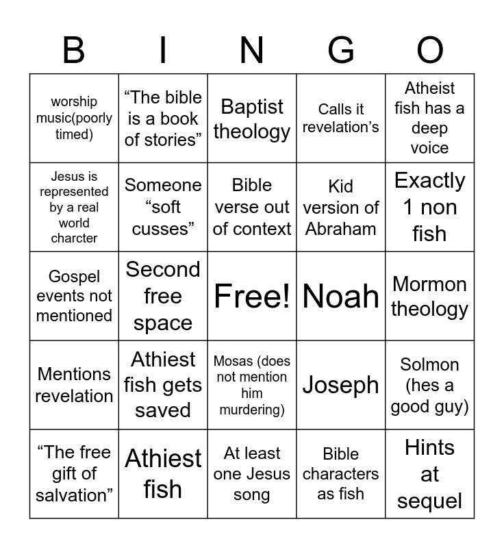 This bingo card has a free space and 24 words: Athiest fish gets saved, Athiest fish, Bible verse out of context, “The free gift of salvation”, Atheist fish has a deep voice, worship music(poorly timed), Jesus is represented by a real world charcter, “The bible is a book of stories”, Noah, Mosas (does not mention him murdering), Kid version of Abraham, Gospel events not mentioned, Joseph, Solmon (hes a good guy), Someone “soft cusses”, Bible characters as fish, Mormon theology, Baptist theology, Exactly 1 non fish, Second free space, Hints at sequel, Mentions revelation, Calls it revelation’s and At least one Jesus song.