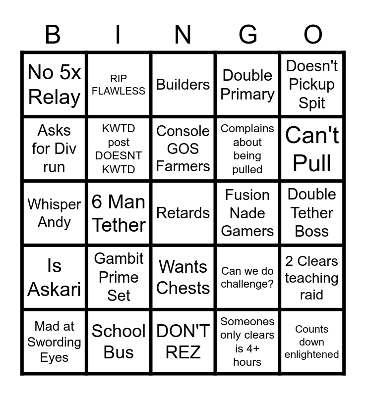 This bingo card has a free space and 24 words: Gambit Prime Set, School Bus, Console GOS Farmers, Mad at Swording Eyes, Doesn't Pickup Spit, No 5x Relay, Asks for Div run, RIP FLAWLESS, Fusion Nade Gamers, Wants Chests, Complains about being pulled, Whisper Andy, Can we do challenge?, 2 Clears teaching raid, KWTD post DOESNT KWTD, Someones only clears is 4+ hours, Double Tether Boss, Builders, Can't Pull, 6 Man Tether, Counts down enlightened, Is Askari, Double Primary and DON'T REZ.