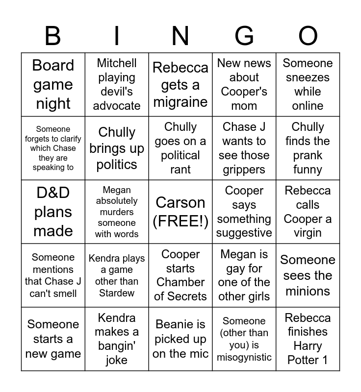 This bingo card has a free space and 24 words: Kendra plays a game other than Stardew, Kendra makes a bangin' joke, Chully goes on a political rant, Someone starts a new game, Someone sneezes while online, Board game night, Someone forgets to clarify which Chase they are speaking to, Mitchell playing devil's advocate, Cooper says something suggestive, Cooper starts Chamber of Secrets, Chase J wants to see those grippers, D&D plans made, Megan is gay for one of the other girls, Someone sees the minions, Chully brings up politics, Someone (other than you) is misogynistic, Rebecca calls Cooper a virgin, Rebecca gets a migraine, Chully finds the prank funny, Megan absolutely murders someone with words, Rebecca finishes Harry Potter 1, Someone mentions that Chase J can't smell, New news about Cooper's mom and Beanie is picked up on the mic.