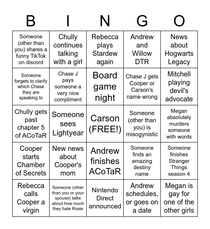 This bingo card has a free space and 24 words: New news about Cooper's mom, Someone (other than you or your spouse) talks about how much they hate Rosie, Board game night, Rebecca calls Cooper a virgin, News about Hogwarts Legacy, Someone (other than you) shares a funny TikTok on discord, Someone forgets to clarify which Chase they are speaking to, Chully continues talking with a girl, Someone (other than you) is misogynistic, Andrew finishes ACoTaR, Chase J gets Cooper or Carson's name wrong, Chully gets past chapter 5 of ACoTaR, Someone finds an amazing destiny name, Someone finishes Stranger Things season 4, Chase J pays someone a very nice compliment, Andrew schedules, or goes on a date, Megan absolutely murders someone with words, Rebecca plays Stardew again, Mitchell playing devil's advocate, Someone sees Lightyear, Megan is gay for one of the other girls, Cooper starts Chamber of Secrets, Andrew and Willow DTR and Nintendo Direct announced.