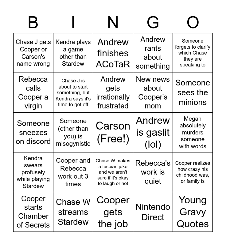This bingo card has a free space and 24 words: Cooper and Rebecca work out 3 times, Chase W streams Stardew, Andrew gets irrationally frustrated, Cooper starts Chamber of Secrets, Someone forgets to clarify which Chase they are speaking to, Chase J gets Cooper or Carson's name wrong, Rebecca calls Cooper a virgin, Kendra plays a game other than Stardew, Andrew is gaslit (lol), Chase W makes a lesbian joke and we aren't sure if it's okay to laugh or not, New news about Cooper's mom, Someone sneezes on discord, Rebecca's work is quiet, Cooper realizes how crazy his childhood was, or family is, Chase J is about to start something, but Kendra says it's time to get off, Nintendo Direct, Megan absolutely murders someone with words, Andrew finishes ACoTaR, Someone sees the minions, Someone (other than you) is misogynistic, Young Gravy Quotes, Kendra swears profusely while playing Stardew, Andrew rants about something and Cooper gets the job.