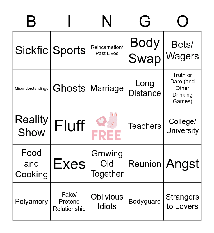 This bingo card has a free space and 24 words: Exes, Fake/ Pretend Relationship, Marriage, Polyamory, Bets/ Wagers, Sickfic, Misunderstandings, Sports, Teachers, Growing Old Together, Long Distance, Reality Show, Reunion, Angst, Ghosts, Bodyguard, College/ University, Reincarnation/ Past Lives, Truth or Dare (and Other Drinking Games), Fluff, Strangers to Lovers, Food and Cooking, Body Swap and Oblivious Idiots.