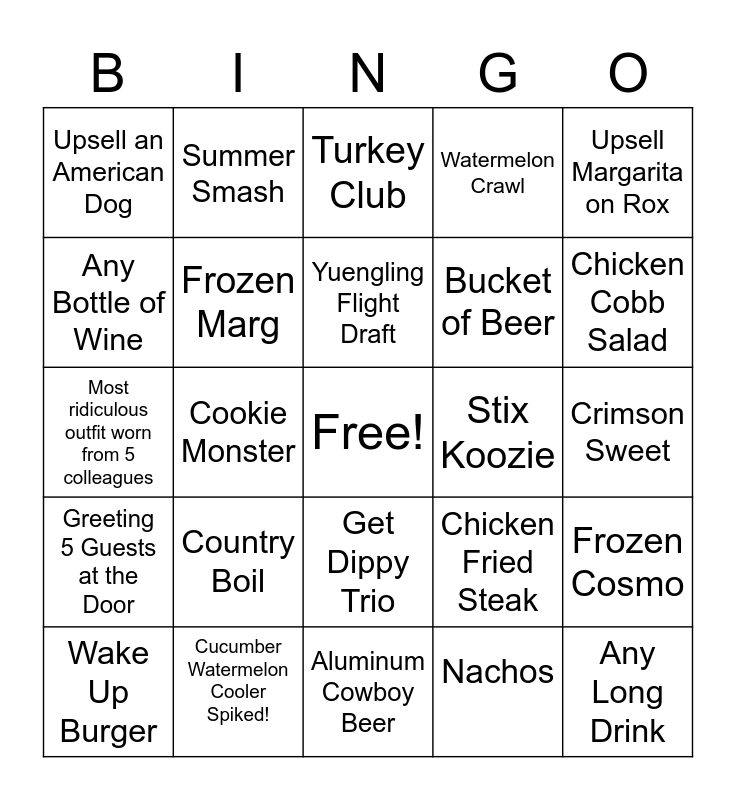 This bingo card has a free space and 29 words: Wake Up Burger, Lucky's Dole Whip, Cookie Monster, Loaded Fries, Upsell an American Dog, Turkey Club, Frozen Marg, Country Boil, Stix Koozie, Cucumber Watermelon Cooler Spiked!, Crimson Sweet, Any Long Drink, Aluminum Cowboy Beer, Nachos, Chicken Cobb Salad, New Stix Hat, Get Dippy Trio, Greeting 5 Guests at the Door, Upsell Margarita on Rox, Most ridiculous outfit worn from 5 colleagues, Chicken Fried Steak, Hot Lips, Bucket of Beer, Any Bottle of Wine, Watermelon Crawl, Summer Smash, Frozen Cosmo, Yuengling Flight Draft and Mimosa Flight.
