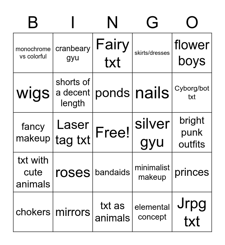 This bingo card has a free space and 24 words: roses, mirrors, ponds, chokers, flower boys, monochrome vs colorful, wigs, cranbeary gyu, silver gyu, bandaids, nails, fancy makeup, minimalist makeup, princes, shorts of a decent length, elemental concept, bright punk outfits, Fairy txt, Cyborg/bot txt, Laser tag txt, Jrpg txt, txt with cute animals, skirts/dresses and txt as animals.