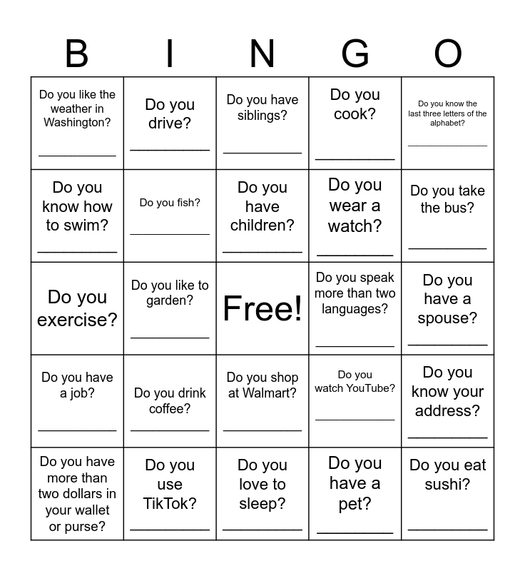 This bingo card has a free space and 24 words: Do you drink coffee? ___________, Do you use TikTok? _________, Do you have children? _________, Do you have more than two dollars in your wallet or purse?, Do you know the last three letters of the alphabet? __________________, Do you like the weather in Washington? ____________, Do you know how to swim? _________, Do you drive? _________, Do you speak more than two languages? ___________, Do you shop at Walmart? ___________, Do you wear a watch? ________, Do you exercise?, Do you watch YouTube? _____________, Do you know your address? _________, Do you fish? _____________, Do you have a pet? ________, Do you have a spouse? _________, Do you have siblings? ___________, Do you take the bus? __________, Do you like to garden? ___________, Do you eat sushi? _________, Do you have a job? ___________, Do you cook? _________ and Do you love to sleep? _________.