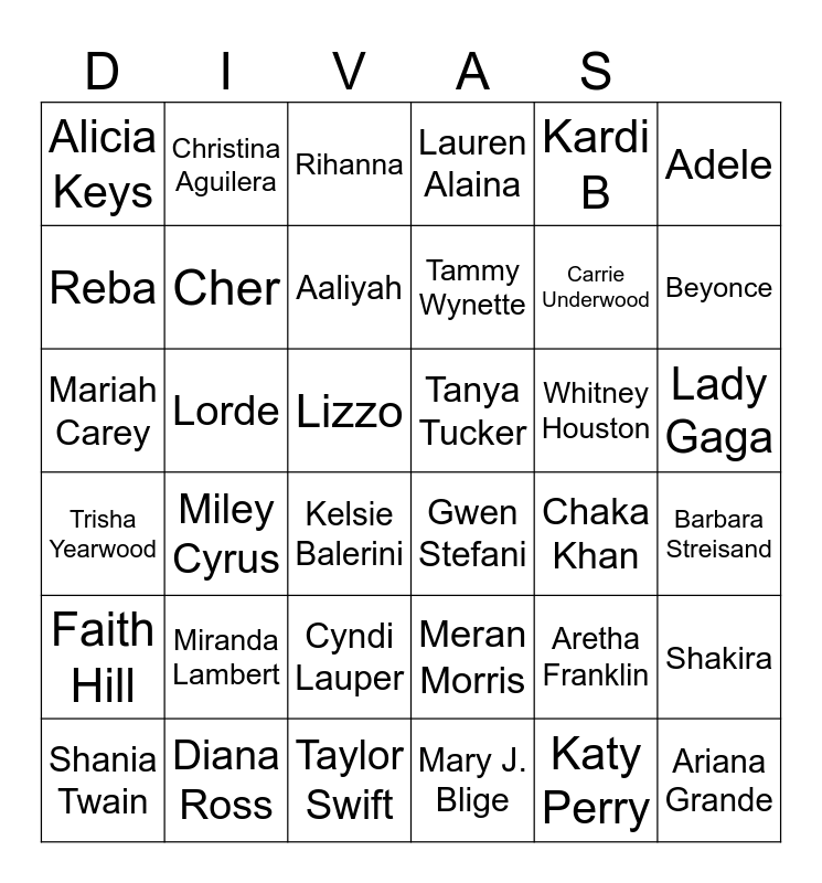 This bingo card has 68 words: Fantasia, Mariah Carey, Celine Dion, Diana Ross, Aretha Franklin, Patti La Belle, Christina Aguilera, Brittney Speeds, Cher, Madonna, Lady Gaga, Pink, Lizzo, Kardi B, Lil Kim, Adele, Beyonce, Alicia Keys, Free!, Whitney Houston, Aaliyah, Trisha Yearwood, Tanya Tucker, Faith Hill, Loretta Lynn, Kelly Clarkson, Katy Perry, Ariana Grande, Miley Cyrus, Gretchen Wilson, Rihanna, Amy Winehouse, Martina McBride, Leona Lewis, Lauren Alaina, Shania Twain, Dolly Parton, Kelsie Balerini, Tammy Wynette, Carrie Underwood, Miranda Lambert, Lacey Musgraves, Reba, Jo Dee Mesina, Sia, Jennifer Hudson, Mary J. Blige, Taylor Swift, Lorde, Gwen Stefani, Meran Morris, Lainey Wilson, Billie Eilish, Chaka Khan, Billie Holiday, Ella Fitzgerald, Barbara Streisand, Janet Jackson, Carole King, Shakira, Stevie Nicks, Gloria Estefan, Dionne Warwick, Etta James, Donna Summer, Amy Grant, Cyndi Lauper and Jennifer Lopez.