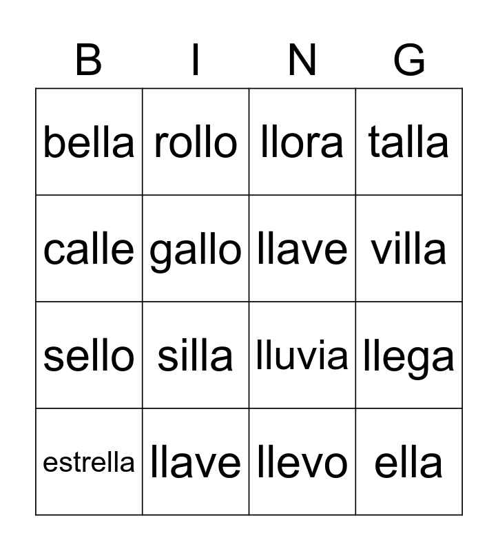 This bingo card has 16 words: llave, llega, llora, bella, sello, rollo, lluvia, llevo, calle, gallo, estrella, talla, silla, villa, llave and ella.