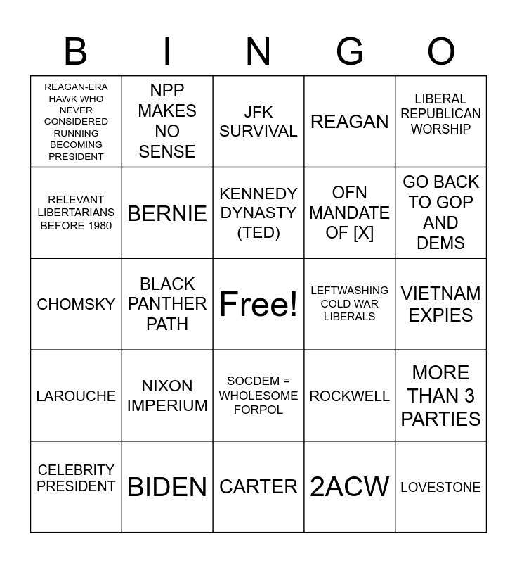 This bingo card has a free space and 24 words: NIXON IMPERIUM, BIDEN, KENNEDY DYNASTY (TED), CELEBRITY PRESIDENT, LIBERAL REPUBLICAN WORSHIP, REAGAN-ERA HAWK WHO NEVER CONSIDERED RUNNING BECOMING PRESIDENT, RELEVANT LIBERTARIANS BEFORE 1980, NPP MAKES NO SENSE, LEFTWASHING COLD WAR LIBERALS, SOCDEM = WHOLESOME FORPOL, OFN MANDATE OF [X], CHOMSKY, ROCKWELL, MORE THAN 3 PARTIES, BERNIE, 2ACW, VIETNAM EXPIES, JFK SURVIVAL, GO BACK TO GOP AND DEMS, BLACK PANTHER PATH, LOVESTONE, LAROUCHE, REAGAN and CARTER.