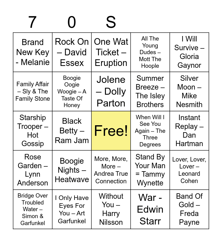 This bingo card has a free space and 90 words: Hold Your Head Up – Argent, It Never Rains In Southern California – Albert Hammond, More, More, More – Andrea True Connection, Baby Don’t Get Hooked On Me – Mac Davis, Yes Sir I Can Boogie - Baccara, Mandy – Barry Manilow, Bye, Bye Baby – Bay City Rollers, Ain’t No Sunshine When She’s Gone - Bill Withers, Love Really Hurts Without You – Billy Ocean, Me & Mrs Jones – Billy Paul, I Can Help – Billy Swan, More Than A Feeling - Boston, I’m A California Man – Cheap Trick, Instant Replay – Dan Hartman, Gonna Make You A Star – David Essex, Jolene – Dolly Parton, Living Thing – Electric Light Orchestra, All By Myself – Eric Carmen, Every Day Hurts – Sad Café, Fire – Pointer Sisters, Girls, Girls, Girls – Sailor, Midnight Train To Georgia – Gladys Knight, Without You – Harry Nilsson, Rock The Boat – Hues Corporation, Starship Trooper – Hot Gossip, I Only Have Eyes For You – Art Garfunkel, If You Don’t Know Me By Now – Harold Melvin, San Bernadino – Jeff Christie, This Thing Called Love- Johnny Cash, Take On All The World –Judas Priest, Wayward Son – Kansas, Lover, Lover, Lover – Leonard Cohen, Love Train – The O’Jays, Rose Garden – Lynn Anderson, Brand New Key - Melanie, All The Young Dudes – Mott The Hoople, One Wat Ticket – Eruption, Because The Night – Patti Smith, Black Betty – Ram Jam, Silver Moon – Mike Nesmith, Bridge Over Troubled Water – Simon & Garfunkel, Family Affair – Sly & The Family Stone, Suicide Is Painless - The Ron Hicklin Singers, Sylvia’s Mother – Dr Hook, Lying In The Arms Of Mary – Sutherland Brothers, Stand By Your Man = Tammy Wynette, Tears On My Pillow = Johnny Nash, Cat Scratch Fever – Ted Nugent, Kissing In The Back Row – The Drifters, Best Of My Love – The Emotions, American Woman – The Guess Who, Summer Breeze – The Isley Brothers, Blame It On The Boogie – The Jackson 5, Kiss & Say Goodbye – The Manhattans, The Most Beautiful Girl In The World – Charlie Rich, I’m In The Mood For Dancing – The Nolans, When Will I See You Again – The Three Degrees, There Goes Another Love Song – The Outlaws, This Is It - Melba Moore, Tie A Yellow Ribbon – Dawn ft Tony Orlando, I Love To Love – Tina Charles, Too Much, Too Little, Too Late _ Deniece Williams, Turn The Beat Around – Vicki Sue Robunson, What Can I Say – Boz Scaggs, Play That Funky Music – Wild Cherry, Pearl’s A Singer – Elkie Brooks, Lady Marmalade - Patti Labelle, War - Edwin Starr, Heart Of Glass – Blondie, Staying Alive – Bee Gees, Boogie Nights – Heatwave, Band Of Gold – Freda Payne, I’m Not In Love – 10CC, It’s A Heartache – Bonnie Tyler, Rock On – David Essex, Boogie Oogie Woogie – A Taste Of Honey, January - Pilot, Ballroom Blitz - Sweet, No Regrets – The Walker Brothers, Cold As Ice - Foreigner, YMCA – Village People, I Will Survive – Gloria Gaynor, Mississippi - Pussycat, Under The Moon Of Love - Showaddywaddy, Roll Away The Stone Mott The Hoople, Don’t Stop – Fleetwood Mac, I’d Like To Teach The World To Sing – New Seekers, Ring My Bell – Anita Ward, Five Me A Little More Time – Chairman Of The Board and Some Girls - Racey.