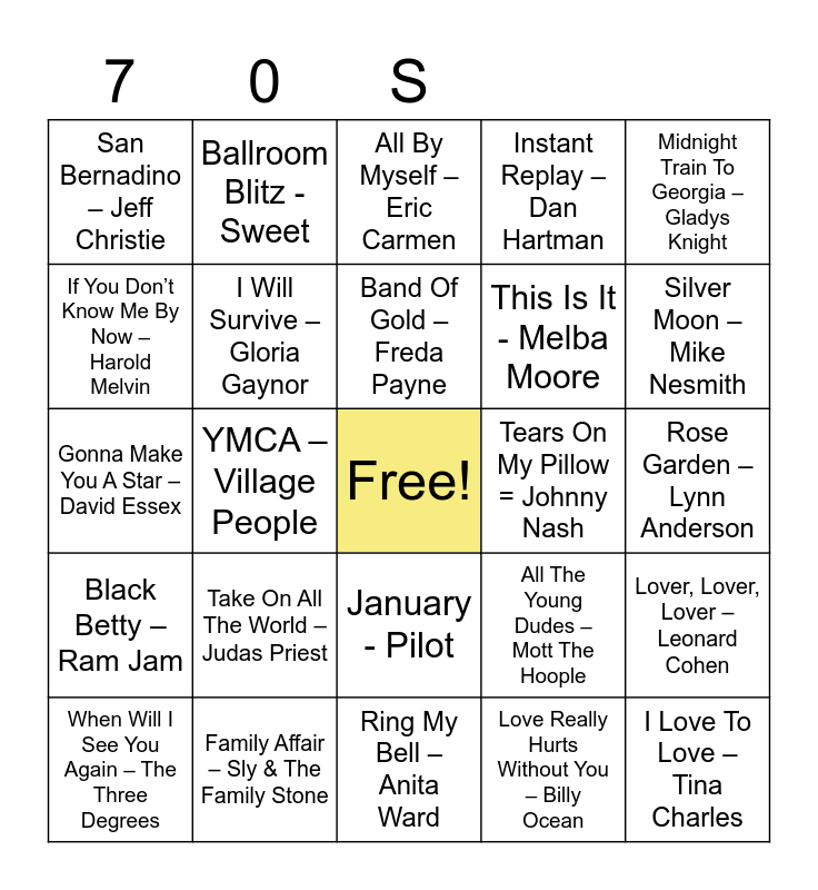This bingo card has a free space and 90 words: What Can I Say – Boz Scaggs, Blame It On The Boogie – The Jackson 5, January - Pilot, Fire – Pointer Sisters, I’d Like To Teach The World To Sing – New Seekers, Cat Scratch Fever – Ted Nugent, Girls, Girls, Girls – Sailor, Mississippi - Pussycat, This Thing Called Love- Johnny Cash, Lying In The Arms Of Mary – Sutherland Brothers, Because The Night – Patti Smith, The Most Beautiful Girl In The World – Charlie Rich, Too Much, Too Little, Too Late _ Deniece Williams, Rose Garden – Lynn Anderson, Every Day Hurts – Sad Café, Band Of Gold – Freda Payne, It’s A Heartache – Bonnie Tyler, No Regrets – The Walker Brothers, Give Me A Little More Time – Chairman Of The Board, Sylvia’s Mother – Dr Hook, Jolene – Dolly Parton, Summer Breeze – The Isley Brothers, Ring My Bell – Anita Ward, Boogie Oogie Woogie – A Taste Of Honey, Gonna Make You A Star – David Essex, Family Affair – Sly & The Family Stone, I Can Help – Billy Swan, Starship Trooper – Hot Gossip, Me & Mrs Jones – Billy Paul, Kiss & Say Goodbye – The Manhattans, More Than A Feeling - Boston, Lover, Lover, Lover – Leonard Cohen, Under The Moon Of Love - Showaddywaddy, Black Betty – Ram Jam, San Bernadino – Jeff Christie, Instant Replay – Dan Hartman, All By Myself – Eric Carmen, Pearl’s A Singer – Elkie Brooks, YMCA – Village People, Silver Moon – Mike Nesmith, When Will I See You Again – The Three Degrees, If You Don’t Know Me By Now – Harold Melvin, Kissing In The Back Row – The Drifters, I’m Not In Love – 10CC, There Goes Another Love Song – The Outlaws, All The Young Dudes – Mott The Hoople, I’m A California Man – Cheap Trick, One Wat Ticket – Eruption, Without You – Harry Nilsson, Play That Funky Music – Wild Cherry, Roll Away The Stone Mott The Hoople, This Is It - Melba Moore, Some Girls - Racey, Cold As Ice - Foreigner, Yes Sir I Can Boogie - Baccara, Bye, Bye Baby – Bay City Rollers, Tears On My Pillow = Johnny Nash, Tie A Yellow Ribbon – Dawn ft Tony Orlando, Boogie Nights – Heatwave, Best Of My Love – The Emotions, Wayward Son – Kansas, Rock The Boat – Hues Corporation, Baby Don’t Get Hooked On Me – Mac Davis, Love Train – The O’Jays, Suicide Is Painless - The Ron Hicklin Singers, Turn The Beat Around – Vicki Sue Robunson, Lady Marmalade - Patti Labelle, Love Really Hurts Without You – Billy Ocean, Brand New Key - Melanie, I Only Have Eyes For You – Art Garfunkel, Take On All The World –Judas Priest, I Love To Love – Tina Charles, Mandy – Barry Manilow, I’m In The Mood For Dancing – The Nolans, Ballroom Blitz - Sweet, I Will Survive – Gloria Gaynor, Ain’t No Sunshine When She’s Gone - Bill Withers, American Woman – The Guess Who, Hold Your Head Up – Argent, Don’t Stop – Fleetwood Mac, Bridge Over Troubled Water – Simon & Garfunkel, Midnight Train To Georgia – Gladys Knight, More, More, More – Andrea True Connection, Stand By Your Man = Tammy Wynette, Heart Of Glass – Blondie, Rock On – David Essex, War - Edwin Starr, Living Thing – Electric Light Orchestra, It Never Rains In Southern California – Albert Hammond and Staying Alive – Bee Gees.