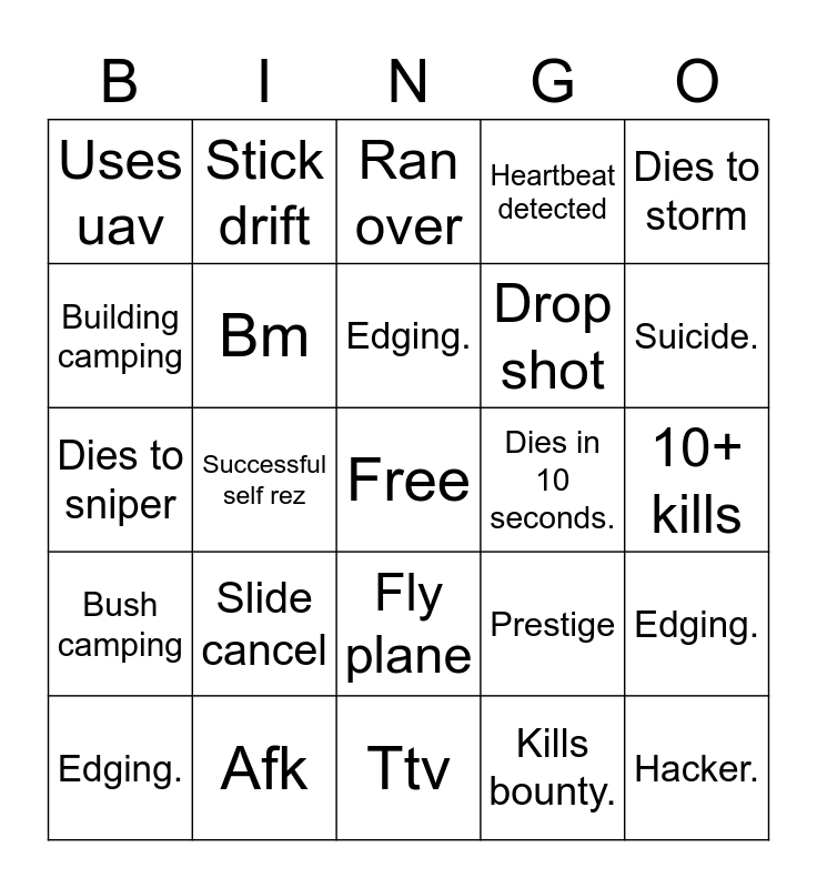 This bingo card has a free space and 29 words: Edging., uses loadout, Successful self rez, Uses cluster, Uses uav, Ran over, Bm, Slide cancel, Dies in 10 seconds., Afk, 10+ kills, Hacker., Ttv, Kills bounty., Suicide., Balloon tower, Fly plane, Bush camping, Dies to storm, Dies to sniper, Prestige, Execution, Drop shot, Building camping, Heartbeat detected, Stick drift, Edging., Edging. and Edging..