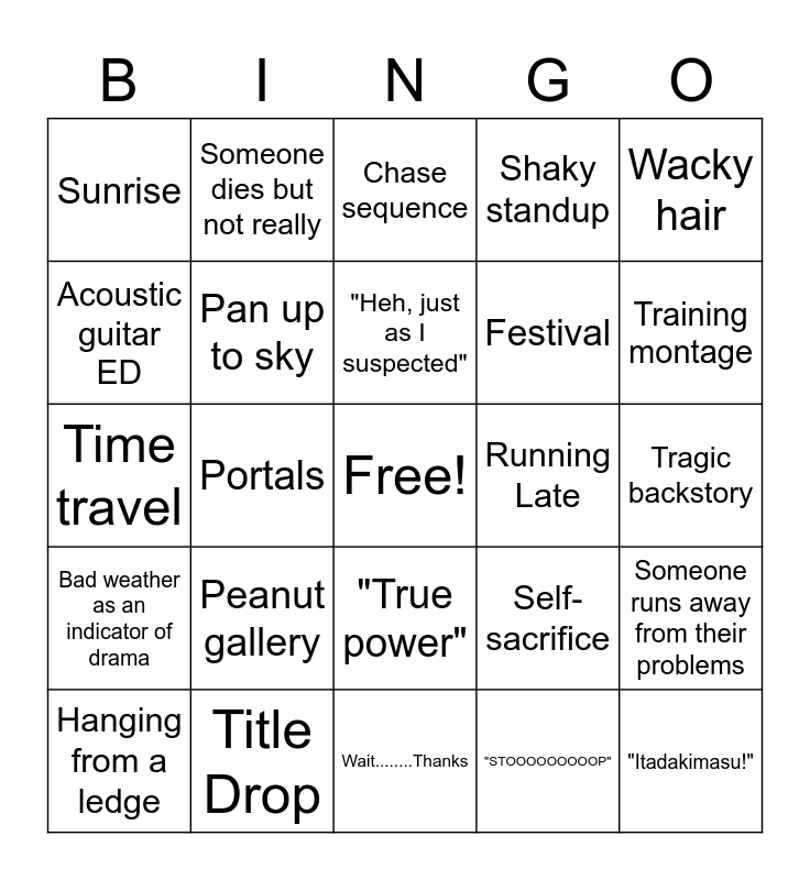 This bingo card has a free space and 68 words: Power of Friendship, "Itadakimasu!", The Chosen One (TM), In ancient times, Ominous prologue, Unnecessary flashback, Someone dies but not really, Someone dies but actually, "Heh, just as I suspected", "I don't need friends", "True power", Eyeball closeuip, Tragic backstory, Wacky hair, Flying battle, Acoustic guitar ED, Portals, Sunrise, Music video sequence, Peanut gallery, Festival, Self-sacrifice, Bad weather as an indicator of drama, Deus ex machina, Chekhov's X, Post credits scene, Ancient artifact, Childhood encounter, Someone runs away from their problems, Beam battle, Chase sequence, Reckless jumping, Form change, "Huh? I thought I saw something", Shaky standup, Pulling an all-nighter, Giant flying contraption, Hanging from a ledge, Training montage, Time travel, Glowing with energy, Summer cicadas, Pan up to sky, Shout the move name, OP as insert song, "NOOOOOO", Multi-pan, THAT'S IMPOSSIBLE, Running Late, Title Drop, Maniacal Laughter, Tournament, Silently Staring at each other, Wait........Thanks, possession, Edge Lord, "STOOOOOOOOOP", Clenched Fist, I'll attack him, HEAD ON, Onsen, you can't die by falling into water, HE'S JUST TOO STRONG/POWERFUL, Oh, it's nothing, Romantic Tension, Frustration Fist Slam, Captain Obvious, "It's too dangerous!" and BAKUMAN.