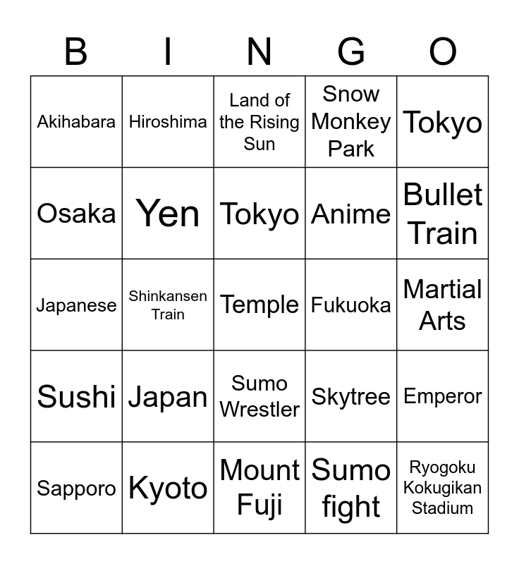 This bingo card has 25 words: Japan, Mount Fuji, Tokyo, Sapporo, Tokyo, Akihabara, Osaka, Hiroshima, Fukuoka, Sumo Wrestler, Anime, Japanese, Skytree, Emperor, Yen, Ryogoku Kokugikan Stadium, Martial Arts, Land of the Rising Sun, Bullet Train, Shinkansen Train, Temple, Kyoto, Sushi, Snow Monkey Park and Sumo fight.