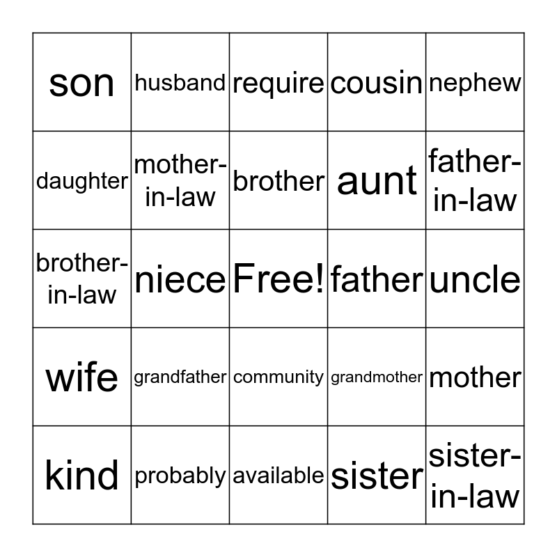 This bingo card has a free space and 24 words: grandfather, probably, brother, kind, nephew, son, daughter, husband, father, community, aunt, brother-in-law, grandmother, mother, mother-in-law, sister, uncle, require, father-in-law, niece, sister-in-law, wife, cousin and available.