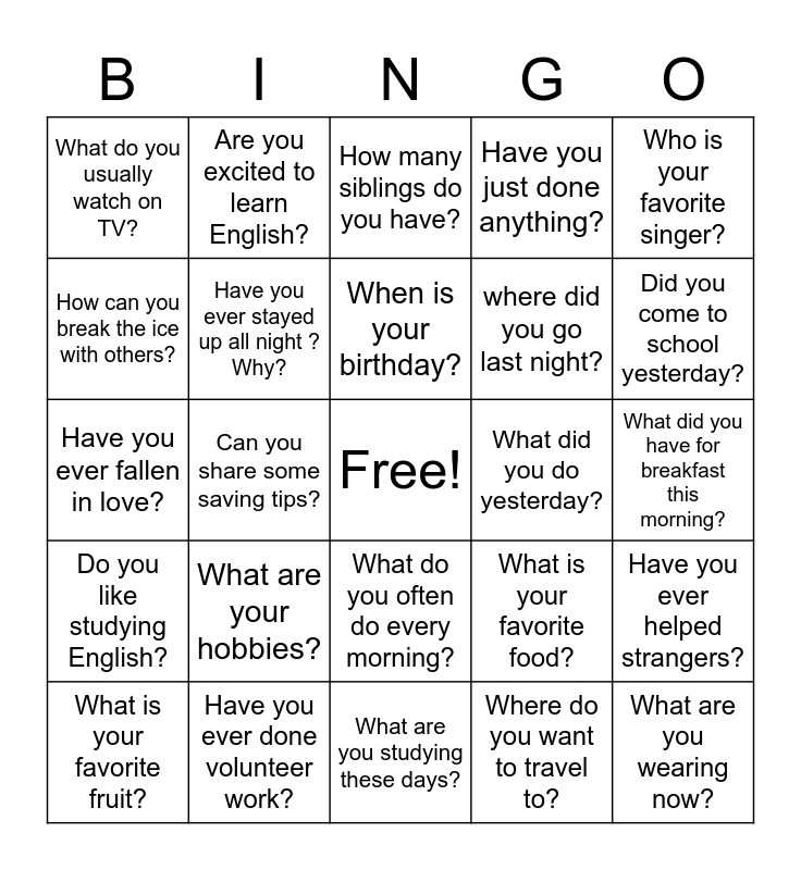 This bingo card has a free space and 24 words: What is your favorite fruit?, What are your hobbies?, When is your birthday?, Where do you want to travel to?, Who is your favorite singer?, What do you usually watch on TV?, Are you excited to learn English?, How many siblings do you have?, What did you do yesterday?, What did you have for breakfast this morning?, Have you ever fallen in love?, Have you ever stayed up all night ? Why?, What is your favorite food?, Have you ever helped strangers?, How can you break the ice with others?, Have you ever done volunteer work?, What are you studying these days?, Have you just done anything?, Did you come to school yesterday?, Do you like studying English?, Can you share some saving tips?, What do you often do every morning?, where did you go last night? and What are you wearing now?.