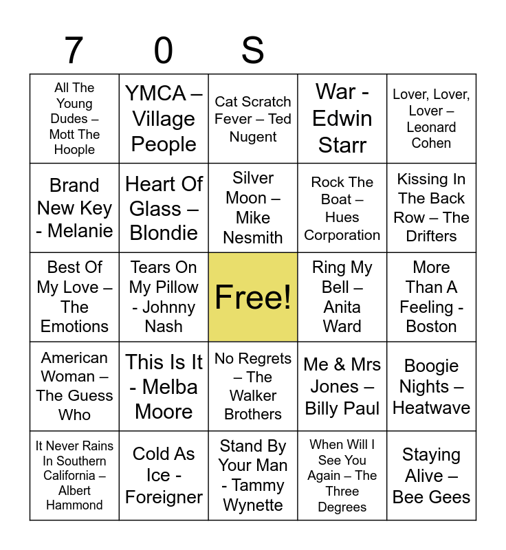 This bingo card has a free space and 90 words: Love Train – The O’Jays, Living Thing – Electric Light Orchestra, No Regrets – The Walker Brothers, Mississippi - Pussycat, Family Affair – Sly & The Family Stone, Rock On – David Essex, Ballroom Blitz - Sweet, Hold Your Head Up – Argent, San Bernadino – Jeff Christie, Without You – Harry Nilsson, Don’t Stop – Fleetwood Mac, Give Me A Little More Time – Chairman Of The Board, It’s A Heartache – Bonnie Tyler, More Than A Feeling - Boston, Lying In The Arms Of Mary – Sutherland Brothers, Silver Moon – Mike Nesmith, I Can Help – Billy Swan, Mandy – Barry Manilow, Bridge Over Troubled Water – Simon & Garfunkel, Pearl’s A Singer – Elkie Brooks, Too Much, Too Little, Too Late - Deniece Williams, Fire – Pointer Sisters, Stand By Your Man - Tammy Wynette, Kiss & Say Goodbye – The Manhattans, Best Of My Love – The Emotions, Cold As Ice - Foreigner, Midnight Train To Georgia – Gladys Knight, Starship Trooper – Hot Gossip, Under The Moon Of Love - Showaddywaddy, Play That Funky Music – Wild Cherry, This Thing Called Love- Johnny Cash, Boogie Nights – Heatwave, Jolene – Dolly Parton, American Woman – The Guess Who, All The Young Dudes – Mott The Hoople, War - Edwin Starr, Cat Scratch Fever – Ted Nugent, More, More, More – Andrea True Connection, Tears On My Pillow - Johnny Nash, Kissing In The Back Row – The Drifters, It Never Rains In Southern California – Albert Hammond, Brand New Key - Melanie, I’m In The Mood For Dancing – The Nolans, Band Of Gold – Freda Payne, Girls, Girls, Girls – Sailor, Me & Mrs Jones – Billy Paul, Instant Replay – Dan Hartman, January - Pilot, There Goes Another Love Song – The Outlaws, Boogie Oogie Woogie – A Taste Of Honey, Wayward Son – Kansas, Rock The Boat – Hues Corporation, Roll Away The Stone - Mott The Hoople, Ain’t No Sunshine When She’s Gone - Bill Withers, Turn The Beat Around – Vicki Sue Robunson, Baby Don’t Get Hooked On Me – Mac Davis, Ring My Bell – Anita Ward, Love Really Hurts Without You – Billy Ocean, Rose Garden – Lynn Anderson, Sylvia’s Mother – Dr Hook, I Love To Love – Tina Charles, Every Day Hurts – Sad Café, Some Girls - Racey, Because The Night – Patti Smith, I Will Survive – Gloria Gaynor, I’d Like To Teach The World To Sing – New Seekers, The Most Beautiful Girl In The World – Charlie Rich, When Will I See You Again – The Three Degrees, I Only Have Eyes For You – Art Garfunkel, One Wat Ticket – Eruption, This Is It - Melba Moore, Staying Alive – Bee Gees, All By Myself – Eric Carmen, Tie A Yellow Ribbon – Dawn ft Tony Orlando, YMCA – Village People, Heart Of Glass – Blondie, If You Don’t Know Me By Now – Harold Melvin, I’m A California Man – Cheap Trick, I’m Not In Love – 10CC, Blame It On The Boogie – The Jackson 5, Yes Sir I Can Boogie - Baccara, Lover, Lover, Lover – Leonard Cohen, Bye, Bye Baby – Bay City Rollers, What Can I Say – Boz Scaggs, Lady Marmalade - Patti Labelle, Suicide Is Painless - The Ron Hicklin Singers, Gonna Make You A Star – David Essex, Take On All The World –Judas Priest, Black Betty – Ram Jam and Summer Breeze – The Isley Brothers.