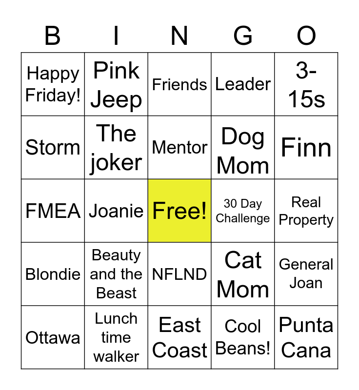 This bingo card has a free space and 26 words: NFLND, Cool Beans!, Mentor, Lunch time walker, 3-15s, Happy Friday!, Storm, Pink Jeep, Real Property, Cat Mom, Dog Mom, FMEA, General Joan, Ottawa, Joanie, Celebrator, Leader, Blondie, Friends, Punta Cana, Finn, East Coast, 30 Day Challenge, Beauty and the Beast, The joker and Painter.