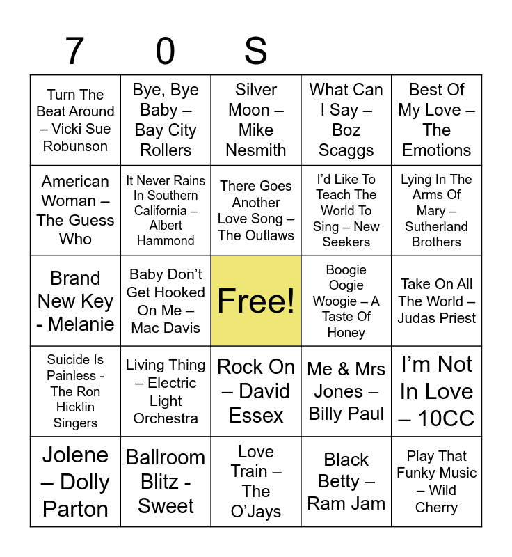 This bingo card has a free space and 90 words: Fire – Pointer Sisters, Rock The Boat – Hues Corporation, Rock On – David Essex, Sylvia’s Mother – Dr Hook, Family Affair – Sly & The Family Stone, More Than A Feeling - Boston, Don’t Stop – Fleetwood Mac, Too Much, Too Little, Too Late - Deniece Williams, Boogie Nights – Heatwave, Under The Moon Of Love - Showaddywaddy, Blame It On The Boogie – The Jackson 5, I Only Have Eyes For You – Art Garfunkel, All The Young Dudes – Mott The Hoople, Take On All The World –Judas Priest, Stand By Your Man - Tammy Wynette, There Goes Another Love Song – The Outlaws, Summer Breeze – The Isley Brothers, More, More, More – Andrea True Connection, I’m In The Mood For Dancing – The Nolans, Ain’t No Sunshine When She’s Gone - Bill Withers, Kiss & Say Goodbye – The Manhattans, Hold Your Head Up – Argent, Love Train – The O’Jays, Cat Scratch Fever – Ted Nugent, Brand New Key - Melanie, Ballroom Blitz - Sweet, No Regrets – The Walker Brothers, Starship Trooper – Hot Gossip, Ring My Bell – Anita Ward, January - Pilot, Midnight Train To Georgia – Gladys Knight, I’m Not In Love – 10CC, I’m A California Man – Cheap Trick, Suicide Is Painless - The Ron Hicklin Singers, Turn The Beat Around – Vicki Sue Robunson, What Can I Say – Boz Scaggs, Silver Moon – Mike Nesmith, Every Day Hurts – Sad Café, Baby Don’t Get Hooked On Me – Mac Davis, Lying In The Arms Of Mary – Sutherland Brothers, Jolene – Dolly Parton, American Woman – The Guess Who, One Wat Ticket – Eruption, YMCA – Village People, Yes Sir I Can Boogie - Baccara, Me & Mrs Jones – Billy Paul, The Most Beautiful Girl In The World – Charlie Rich, Lady Marmalade - Patti Labelle, Give Me A Little More Time – Chairman Of The Board, Bridge Over Troubled Water – Simon & Garfunkel, Because The Night – Patti Smith, I’d Like To Teach The World To Sing – New Seekers, This Is It - Melba Moore, I Love To Love – Tina Charles, Rose Garden – Lynn Anderson, Lover, Lover, Lover – Leonard Cohen, Boogie Oogie Woogie – A Taste Of Honey, Staying Alive – Bee Gees, Tears On My Pillow - Johnny Nash, Girls, Girls, Girls – Sailor, I Will Survive – Gloria Gaynor, Mississippi - Pussycat, Roll Away The Stone - Mott The Hoople, Mandy – Barry Manilow, Kissing In The Back Row – The Drifters, When Will I See You Again – The Three Degrees, San Bernadino – Jeff Christie, Black Betty – Ram Jam, War - Edwin Starr, Wayward Son – Kansas, Living Thing – Electric Light Orchestra, Play That Funky Music – Wild Cherry, Pearl’s A Singer – Elkie Brooks, I Can Help – Billy Swan, Bye, Bye Baby – Bay City Rollers, It Never Rains In Southern California – Albert Hammond, Instant Replay – Dan Hartman, All By Myself – Eric Carmen, This Thing Called Love- Johnny Cash, It’s A Heartache – Bonnie Tyler, Cold As Ice - Foreigner, Best Of My Love – The Emotions, Some Girls - Racey, If You Don’t Know Me By Now – Harold Melvin, Love Really Hurts Without You – Billy Ocean, Gonna Make You A Star – David Essex, Heart Of Glass – Blondie, Tie A Yellow Ribbon – Dawn ft Tony Orlando, Band Of Gold – Freda Payne and Without You – Harry Nilsson.