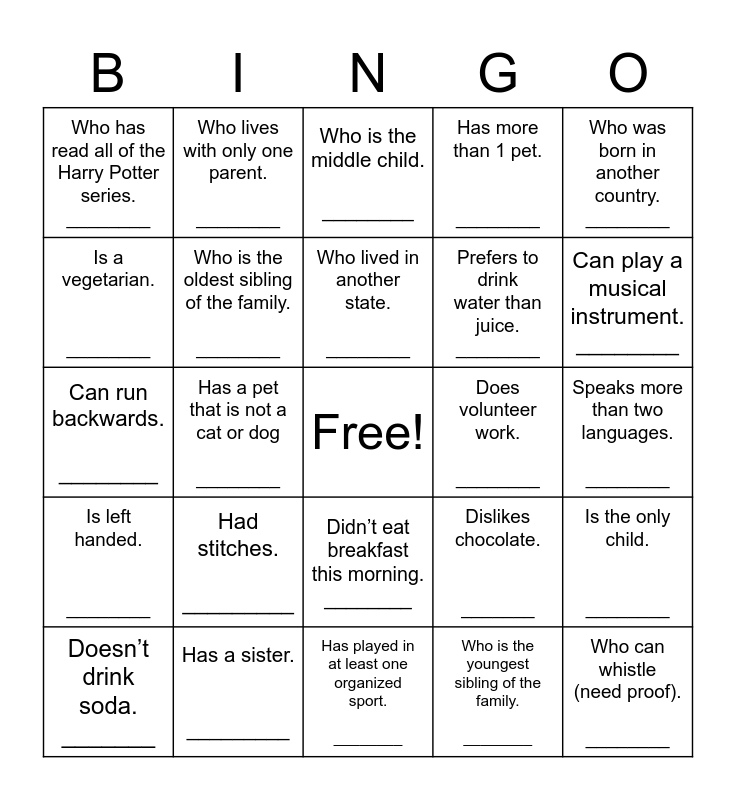 This bingo card has a free space and 24 words: Had stitches. _________, Has a sister. _________, Who lived in another state. ________, Doesn’t drink soda. _______, Who was born in another country. ________, Who has read all of the Harry Potter series. ________, Is a vegetarian. ________, Who lives with only one parent. ________, Does volunteer work. ________, Didn’t eat breakfast this morning. ________, Prefers to drink water than juice. ________, Can run backwards. ________, Dislikes chocolate. _______, Is the only child. ________, Who is the oldest sibling of the family. ________, Who is the youngest sibling of the family. ________, Speaks more than two languages. ________, Who is the middle child. ________, Can play a musical instrument. ________, Has a pet that is not a cat or dog ________, Who can whistle (need proof). ________, Is left handed. ________, Has more than 1 pet. ________ and Has played in at least one organized sport. ________.