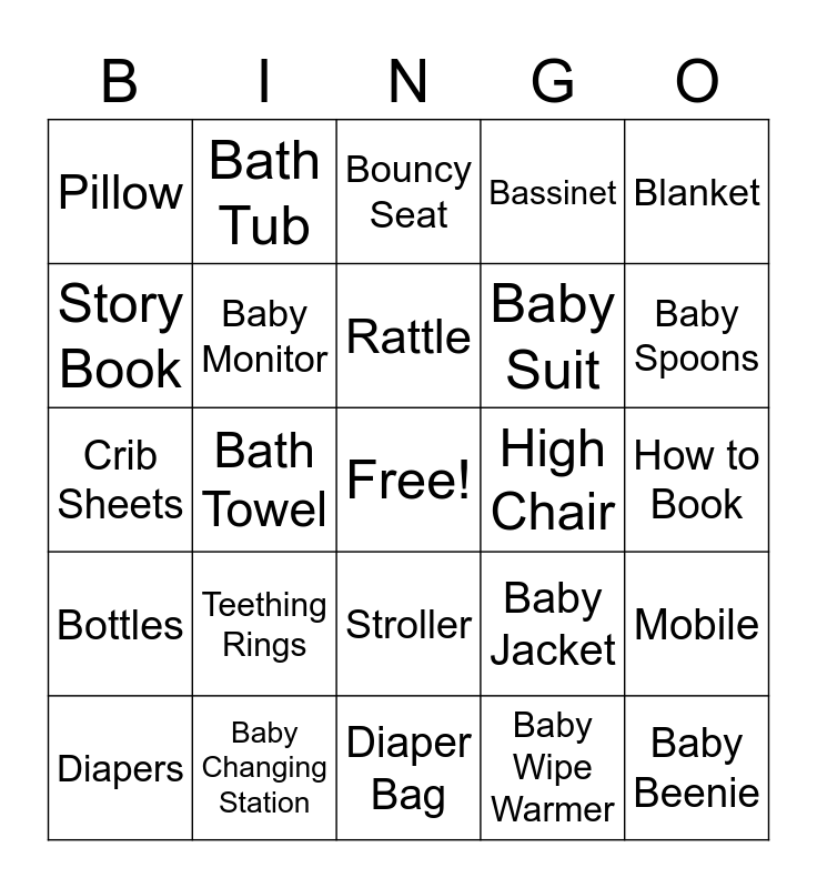This bingo card has a free space and 37 words: Baby Socks, Baby Shoes, Pajamas, Baby Monitor, Mobile, Teething Rings, Rattle, Baby Wipes, Blanket, Pacifier, Bath Towel, Bassinet, Baby Beenie, How to Book, Story Book, Bottles, Bottle Warmer, Bouncy Seat, Stroller, High Chair, Pillow, Baby Spoons, Diapers, Diaper Bag, Baby Wipes, Baby Wipe Warmer, Bath Tub, Bouncy Seat, Breast Milk Cooler, Baby Bibs, Sound Machine, Baby Changing Station, Crib Sheets, Play Mat, Baby Jacket, Baby Suit and Onesies.
