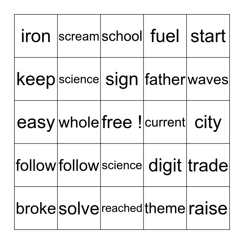 This bingo card has a free space and 24 words: follow, solve, sign, broke, start, iron, keep, scream, current, science, father, easy, digit, trade, science, theme, city, school, waves, whole, raise, follow, fuel and reached.
