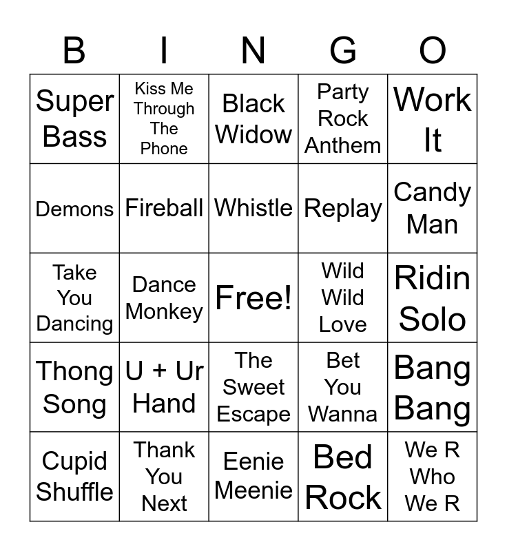 This bingo card has a free space and 29 words: Cupid Shuffle, Wobble, Dance Monkey, Im Blue, Super Bass, Black Widow, Fireball, U + Ur Hand, Wild Wild Love, Thank You Next, Ridin Solo, We R Who We R, Eenie Meenie, Bed Rock, Candy Man, Disturbia, The Sweet Escape, Thong Song, Work It, Take You Dancing, Bet You Wanna, Kings & Queens, Replay, Demons, Party Rock Anthem, Kiss Me Through The Phone, Bang Bang, Whistle and Pumped Up Kicks.