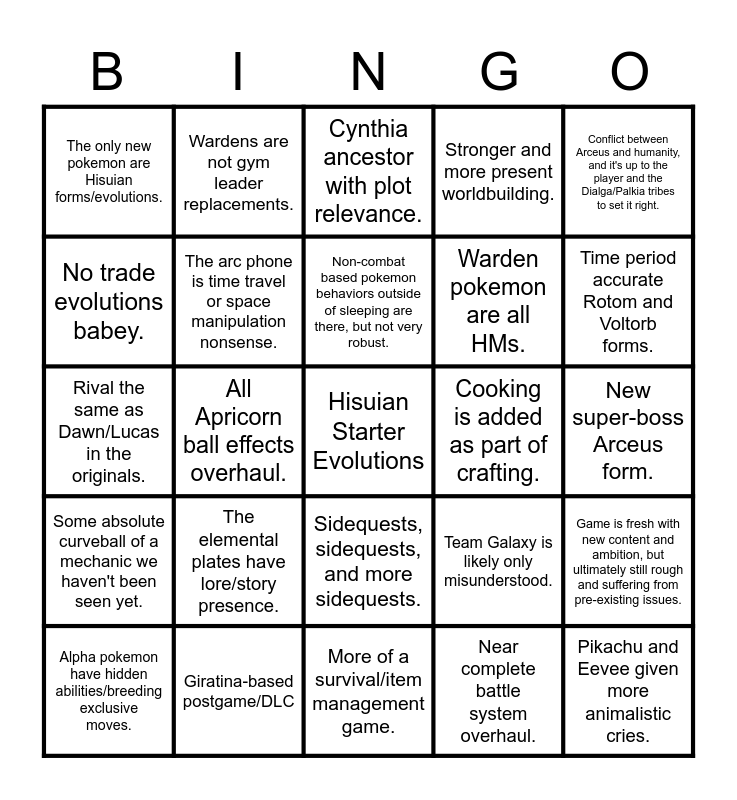 This bingo card has a free space and 24 words: The elemental plates have lore/story presence., Giratina-based postgame/DLC, Non-combat based pokemon behaviors outside of sleeping are there, but not very robust., Alpha pokemon have hidden abilities/breeding exclusive moves., Conflict between Arceus and humanity, and it's up to the player and the Dialga/Palkia tribes to set it right., The only new pokemon are Hisuian forms/evolutions., No trade evolutions babey., Wardens are not gym leader replacements., Cooking is added as part of crafting., Sidequests, sidequests, and more sidequests., Warden pokemon are all HMs., Rival the same as Dawn/Lucas in the originals., Team Galaxy is likely only misunderstood., Game is fresh with new content and ambition, but ultimately still rough and suffering from pre-existing issues., The arc phone is time travel or space manipulation nonsense., Near complete battle system overhaul., New super-boss Arceus form., Cynthia ancestor with plot relevance., Time period accurate Rotom and Voltorb forms., All Apricorn ball effects overhaul., Pikachu and Eevee given more animalistic cries., Some absolute curveball of a mechanic we haven't been seen yet., Stronger and more present worldbuilding. and More of a survival/item management game..