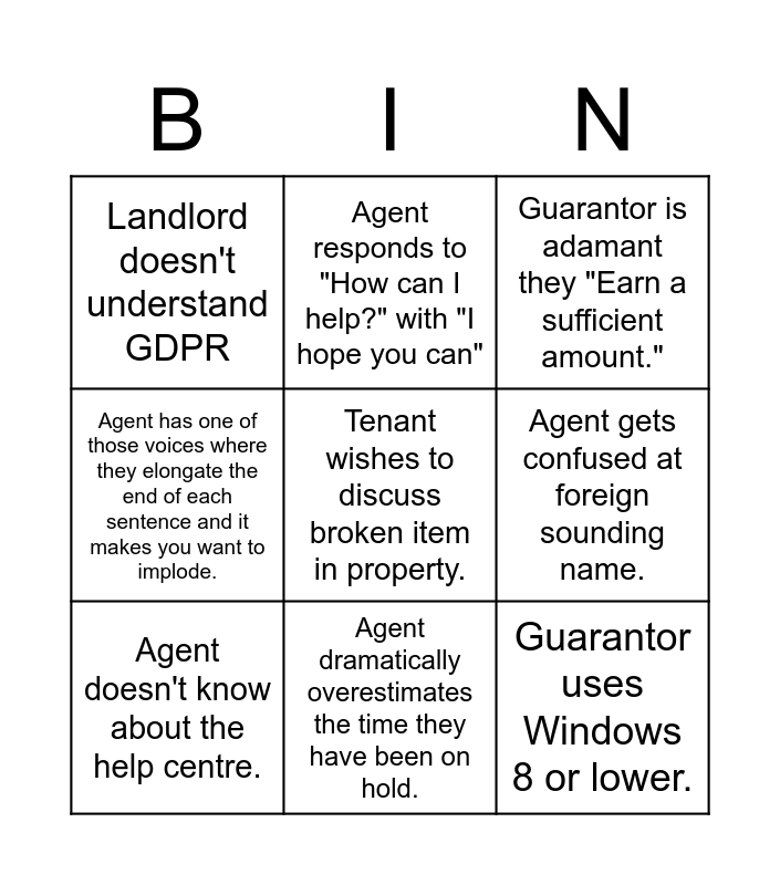 This bingo card has a free space and 8 words: Agent gets confused at foreign sounding name., Guarantor is adamant they "Earn a sufficient amount.", Agent responds to "How can I help?" with "I hope you can", Agent doesn't know about the help centre., Landlord doesn't understand GDPR, Guarantor uses Windows 8 or lower., Agent has one of those voices where they elongate the end of each sentence and it makes you want to implode. and Agent dramatically overestimates the time they have been on hold..