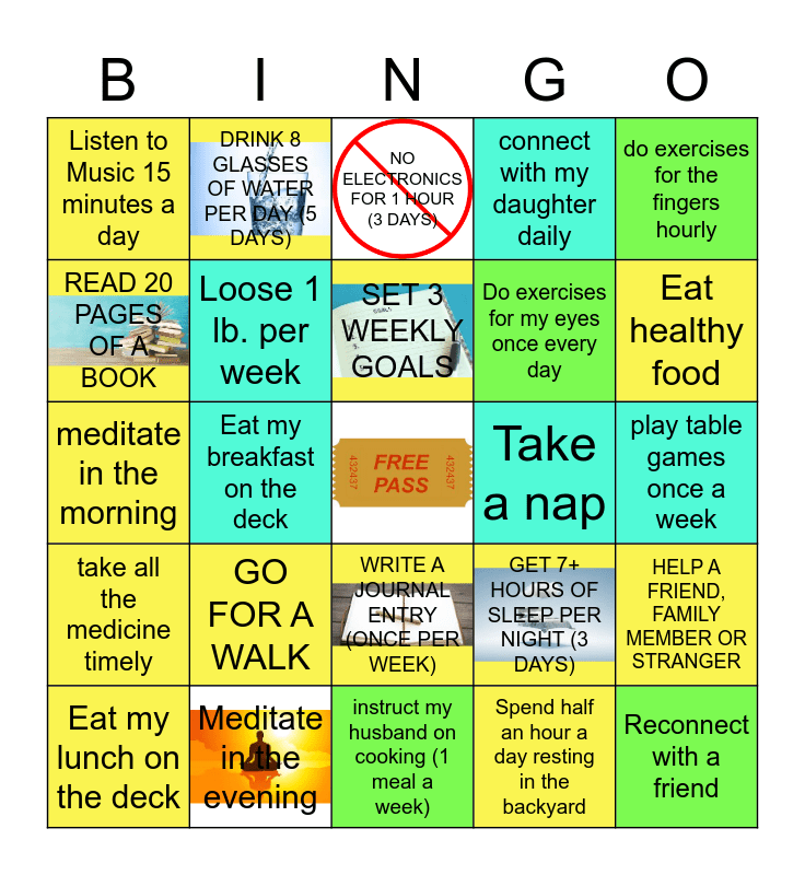 This bingo card has 7 images, a free space and 24 words: GO FOR A WALK, Meditate in the evening, SET 3 WEEKLY GOALS, Eat my lunch on the deck, do exercises for the fingers hourly, Listen to Music 15 minutes a day, READ 20 PAGES OF A BOOK, DRINK 8 GLASSES OF WATER PER DAY (5 DAYS), Take a nap, WRITE A JOURNAL ENTRY (ONCE PER WEEK), Do exercises for my eyes once every day, meditate in the morning, GET 7+ HOURS OF SLEEP PER NIGHT (3 DAYS), HELP A FRIEND, FAMILY MEMBER OR STRANGER, Loose 1 lb. per week, Spend half an hour a day resting in the backyard, play table games once a week, NO ELECTRONICS FOR 1 HOUR (3 DAYS), Eat healthy food, Eat my breakfast on the deck, Reconnect with a friend, take all the medicine timely, connect with my daughter daily and instruct my husband on cooking (1 meal a week).