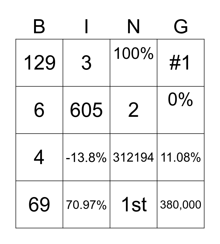 This bingo card has 16 words: 70.97%, 11.08%, 100%, 129, 4, 3, 312194, 1st, 6, 605, 69, #1, -13.8%, 0%, 2 and 380,000.
