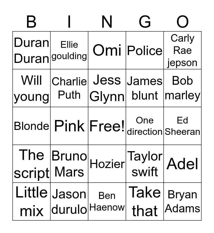 This bingo card has a free space and 24 words: Bruno Mars, Jason durulo, Jess Glynn, Little mix, Carly Rae jepson, Duran Duran, Will young, Ellie goulding, One direction, Hozier, James blunt, Blonde, Taylor swift, Adel, Charlie Puth, Take that, Ed Sheeran, Omi, Bob marley, Pink, Bryan Adams, The script, Police and Ben Haenow.