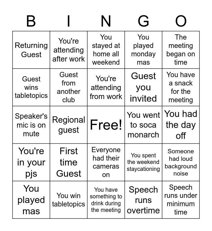 This bingo card has a free space and 24 words: First time Guest, You win tabletopics, You're attending from work, You played mas, The meeting began on time, Returning Guest, Guest wins tabletopics, You're attending after work, You went to soca monarch, Everyone had their cameras on, Guest you invited, Speaker's mic is on mute, You spent the weekend staycationing, Someone had loud background noise, Guest from another club, Speech runs overtime, You had the day off, You stayed at home all weekend, You have a snack for the meeting, Regional guest, Speech runs under minimum time, You're in your pjs, You played monday mas and You have something to drink during the meeting.
