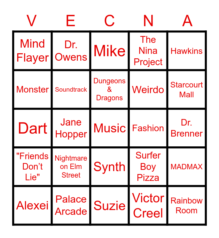 This bingo card has 105 words: Mouth breather, Upside Down, Hawkins, Hellfire Club, Vecna, ‘80s, Weird Al, The NeverEnding Story, Running Up That Hill, Demogorgon, Steve, Nancy, Barb, Eleven, Will, Lucas, Mike, Dustin, Max, Billy, Eddie, Hopper, Joyce, Jonathan, The Duffer Brothers, Nightmare on Elm Street, Starcourt Mall, The Nina Project, Scoops Ahoy, Camp Know Where, Surfer Boy Pizza, Victor Creel, Rink-O-Mania, California, Bob Newby, Erica, Murray, Robin, Dungeons & Dragons, Palace Arcade, Hawkins Lab, "Friends Don’t Lie", Superhero, Monster, Babysitter, Mind Flayer, Family Video, Music, Russia, Rainbow Room, Skull Rock, Argyle, Yuri, Friendship, Eggos, Nosebleed, "Mornings are for coffee and contemplation", "You can’t spell America without Erica", 2016, Synth, Dr. Brenner, Gate, Castle Byers, Supernatural, Netflix, RadioShack, Horror, Dr. Owens, Dart, Jane Hopper, Suzie, Cerebro, Christmas Lights, Dream a Little Dream of Me, Bikes, Pool, Hospital, A.V. Club, Alexei, The Void, Government, Terry Ives, Lando, Soundtrack, Icee, Fashion, Fire, Kali, Should I Stay or Should I Go?, Doctor Zhivago, Lord of the Rings, Master of Puppets, Ghostbusters, Fast Times at Ridgemont High, MADMAX, Nostalgia, Ensemble, Robert Englund, Weirdo, Journalism, Bullies, Powers, D20, Basketball and Enzo.