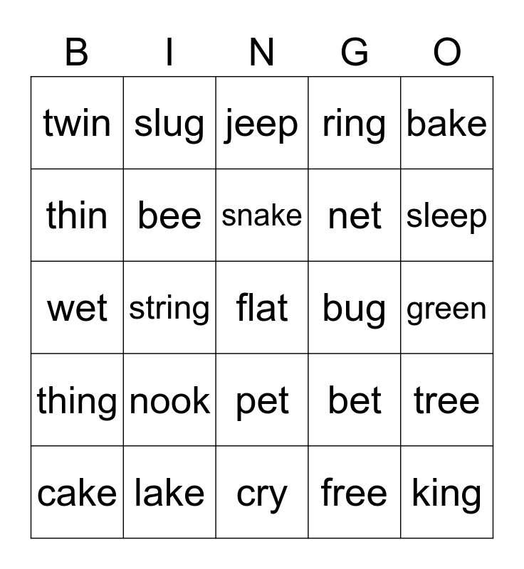 This bingo card has a free space and 24 words: nook, lake, snake, cake, bake, twin, thin, slug, bug, pet, net, wet, bet, tree, bee, free, green, jeep, sleep, string, king, thing, ring and cry.