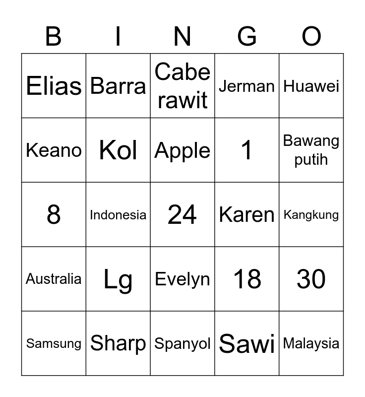 This bingo card has a free space and 24 words: Lg, Sharp, Apple, Samsung, Huawei, Elias, Keano, Barra, Karen, Evelyn, 1, 8, 18, 30, Kol, Sawi, Kangkung, Cabe rawit, Bawang putih, Indonesia, Malaysia, Australia, Jerman and Spanyol.