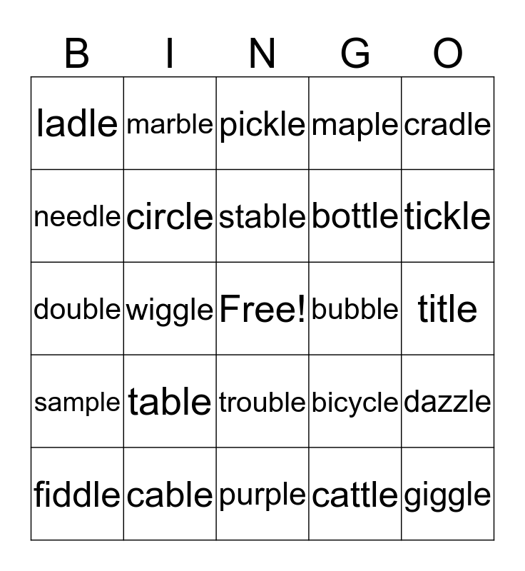 This bingo card has a free space and 24 words: table, cable, stable, fiddle, cradle, ladle, needle, marble, bubble, trouble, bottle, double, bicycle, dazzle, circle, cattle, title, pickle, tickle, wiggle, giggle, sample, maple and purple.