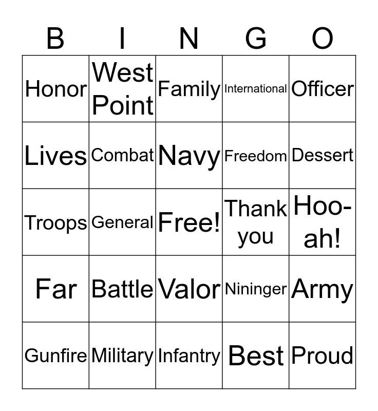 This bingo card has a free space and 25 words: Battle, Infantry, Navy, Gunfire, Officer, Honor, Lives, West Point, Thank you, Valor, Freedom, Troops, Nininger, Army, Combat, Dinner, Hoo-ah!, Family, Dessert, General, Proud, Military, Far, International and Best.