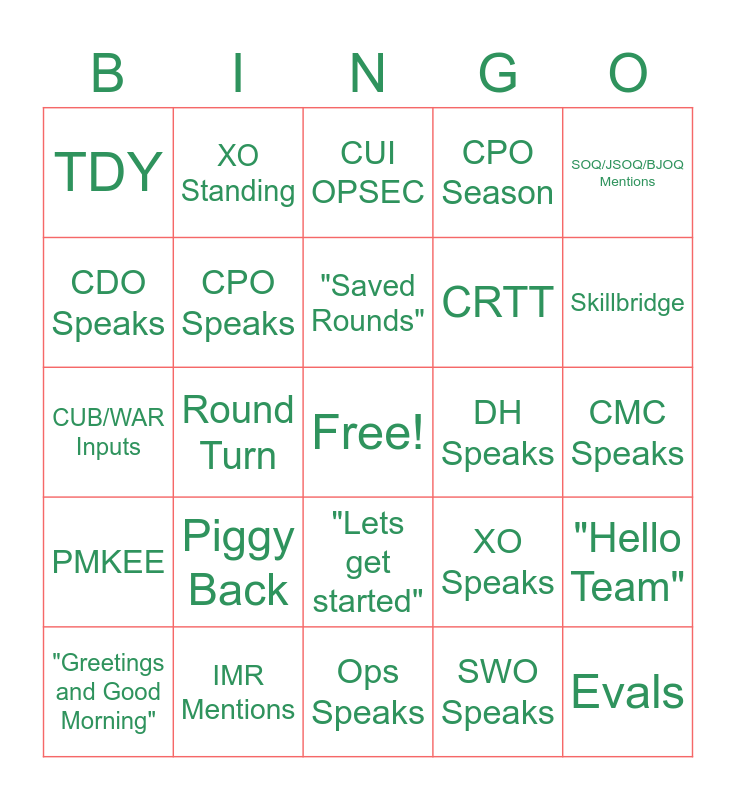 This bingo card has a free space and 24 words: "Greetings and Good Morning", Piggy Back, "Saved Rounds", SWO Speaks, SOQ/JSOQ/BJOQ Mentions, TDY, XO Standing, CUI OPSEC, DH Speaks, CMC Speaks, CUB/WAR Inputs, CPO Speaks, XO Speaks, "Hello Team", CDO Speaks, IMR Mentions, Ops Speaks, CPO Season, Skillbridge, PMKEE, Round Turn, "Lets get started", CRTT and Evals.